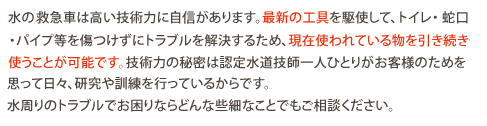 鶴見区の水道トラブルは『水の救急車鶴見区店』が速やかに対応。鶴見緑地での自然の豊かさを反映した、信頼と安心のサービスを365日提供します。トイレつまりや水道水漏れに対して、迅速で質の高い解決策を提供いたします。